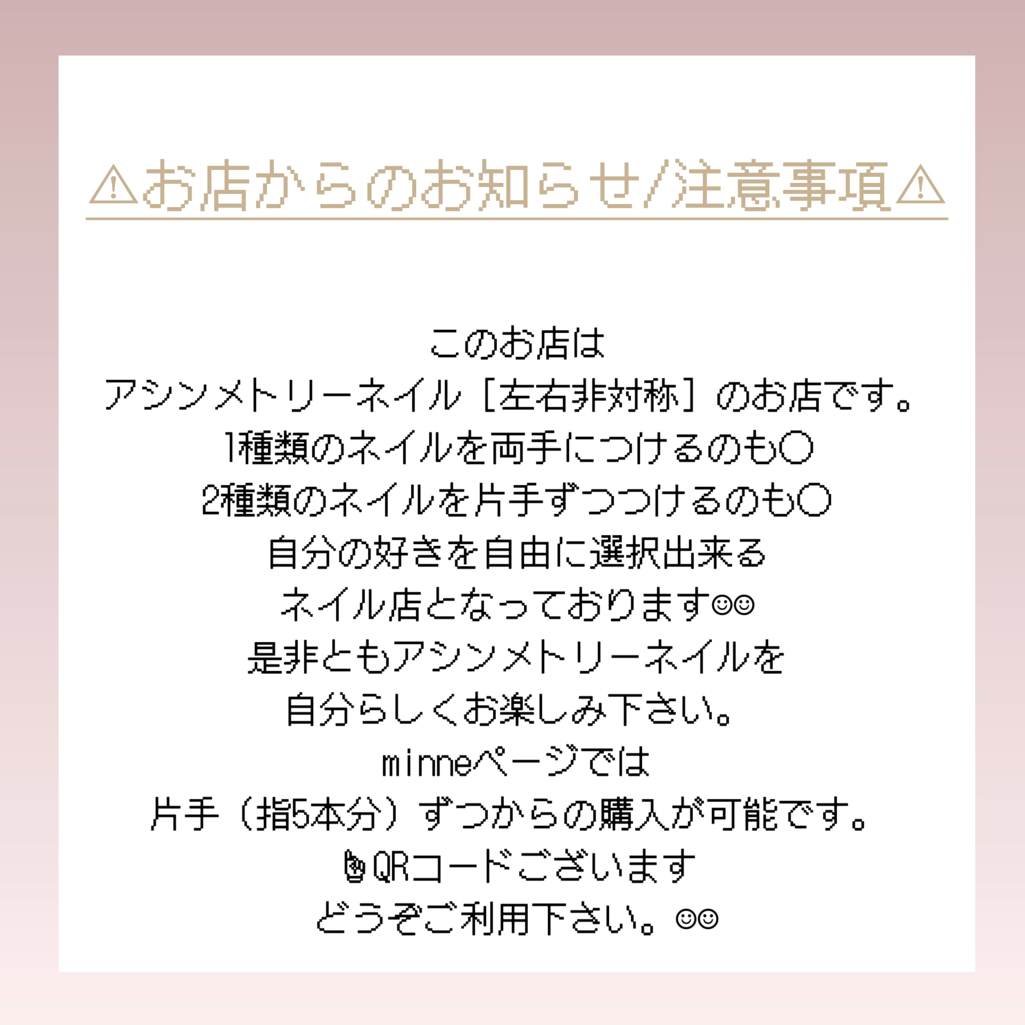 ⚠︎ご購入前にこちらを全てご覧になり、 ご了承の上ご購入下さい。 __サイズオーダー制です__ アシンメトリーネイル可能です。 1種類のネイルを両手につけるのも◯ 2種類のネイルを片手ずつつけるのも◯ 色々な組み合わせをお楽しみください。 コメント概要欄にてサイズを 親指から小指まで順にお知らせ下さい。 クリアピンク、オフホワイトを主に使用して ニュアンスネイルに仕上げました☺︎ ⚠︎注意事項⚠︎ ________________________ ・注意を払い心掛けて作成しておりますが 裏面へのはみ出し/気泡/色むら/ホコリ/等 混入があるかもしれません。 ・自然光で撮影しておりますが、天候や撮り方により サンプルと色味が異なる場合がございます。 ・普通郵便での発送になりますので追跡がありません。 またハンドメイド&土日配達はお休みの為、 作成から到着までに7〜15日程頂いております。 結婚式等の大切なひと時にご使用の際は、 早めの購入をお勧めしております。 ・返金不可でございます ⚠︎上記を確認の上ご購入お待ちしております。 何卒ご了承おきください。 ________________________ ◯梱包◯ ・小箱にて梱包し封筒にて発送 ◯付属品◯ ・粘着テープ ・爪やすり 1つ ・スポンジバッファー 1つ ・甘皮処理、取り外し用ネイルスティック 1本 ※料金は掛かりません ◯ネイルチップ種類◯ ・ベリーショート ・ショートバレリーナ ・ショートオーバル ※サイズ:0〜9 ※計測サイズチップの購入をおすすめしております。 ※ネイルチップ先端は削り整えての販売となります。 ________________________ あなただけのデザイン あなたの大切なお時間を共に過ごすネイルチップ 素敵な時間をお過ごしください、、 ご購入お待ちしております☺︎☺︎ @MISAMA_0000000